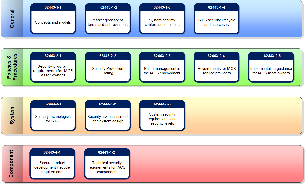 ISA/IEC 62443 standard sections - https://gca.isa.org/hs-fs/hubfs/21-29%20-%20ISAGCA/ISAGCA%20Blog%20Images/ISA-IEC-62443-Standards.png?width=2458&name=ISA-IEC-62443-Standards.png